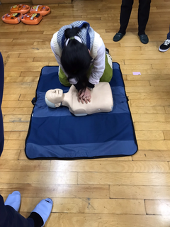 負傷者発見、安全確認、応援要請、胸骨圧迫、人工呼吸、AED使用までを練習(・ω・)